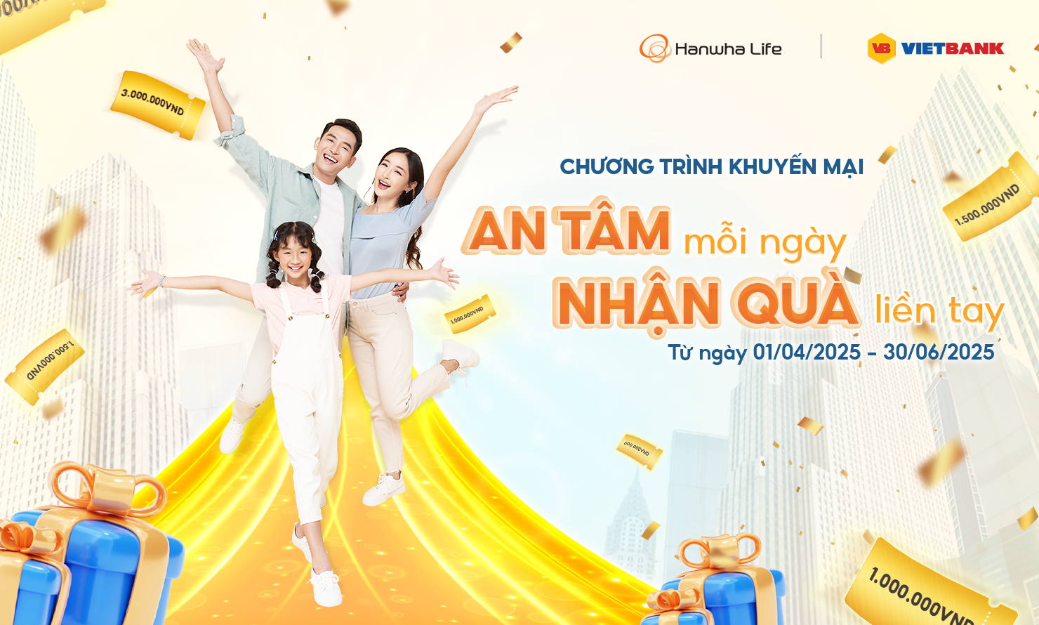 Hanwha Life Việt Nam hân hoan thông báo triển khai chương trình khuyến mại “AN TÂM MỖI NGÀY, NHẬN QUÀ LIỀN TAY” dành cho tất cả các khách hàng tham gia hợp đồng bảo hiểm của Hanwha Life Việt Nam qua ngân hàng VIETBANK với chi tiết như sau: