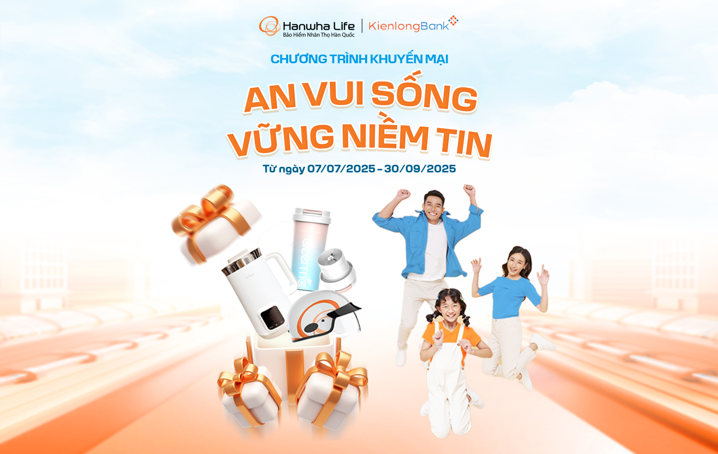 Nhằm tiếp tục mang đến cho khách hàng những kế hoạch bảo vệ và tài chính ưu việt, Hanwha Life Việt Nam triển khai chương trình khuyến mại “AN VUI SỐNG – VỮNG NIỀM TIN” dành cho Khách hàng tham gia Hợp đồng bảo hiểm của Hanwha Life Việt Nam được phân phối thông qua Ngân hàng Thương mại Cổ phần Kiên Long (KienlongBank) với chi tiết như sau: