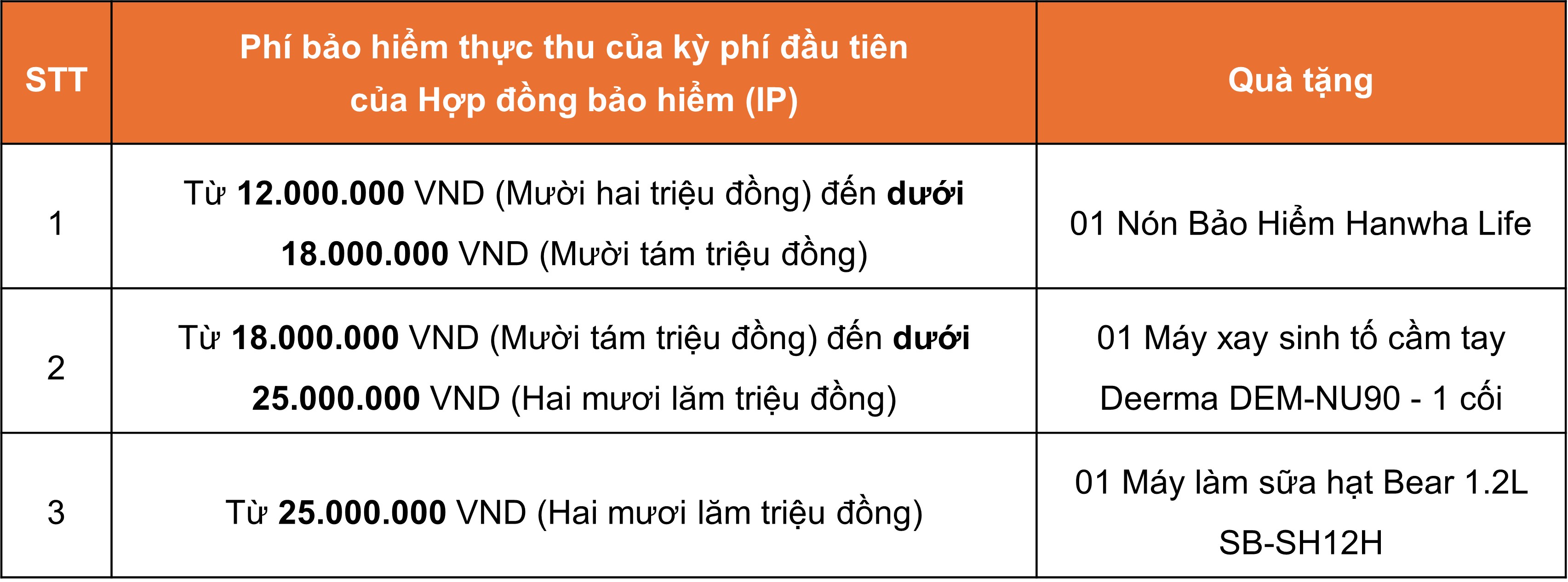 - Trong trường hợp Hanwha Life Việt Nam không thể liên hệ Khách hàng trong vòng 20 ngày kể từ ngày bắt đầu trao quà tặng theo từng Đợt, Hanwha Life Việt Nam sẽ hủy kết quả tặng quà đối với Khách hàng này.