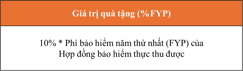 Khách hàng thỏa các điều kiện khuyến mại sẽ được nhận quà tặng là tiền có giá trị tương đương bằng Phí bảo hiểm năm thứ nhất (FYP) của Hợp đồng bảo hiểm thực thu nhân với tỷ lệ tương ứng như sau: