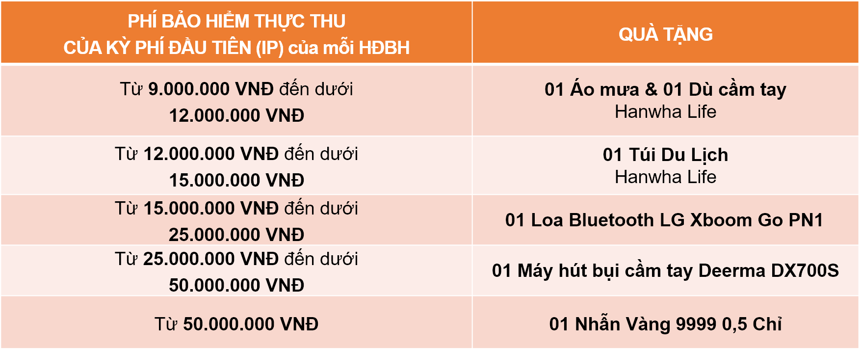 - HĐBH được Hanwha Life phát hành phải nằm trong thời gian khuyến mại; và