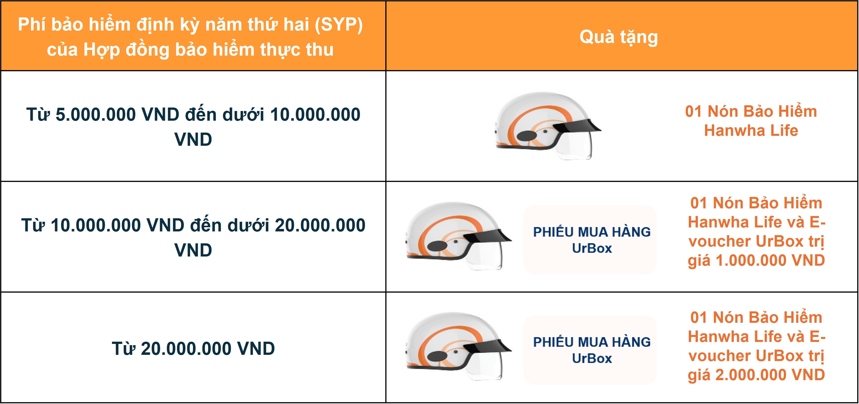 - Đối với quà tặng là E-voucher UrBox: Tại thời điểm trao quà tặng, Hanwha Life Việt Nam sẽ gửi tin nhắn (kèm đường dẫn để sử dụng quà tặng) đến số điện thoại di động mà Khách hàng đã đăng ký với Hanwha Life Việt Nam. Hanwha Life Việt Nam không chịu trách nhiệm trong trường hợp không thể chuyển quà do thông tin cung cấp bị sai/bị nhầm lẫn;