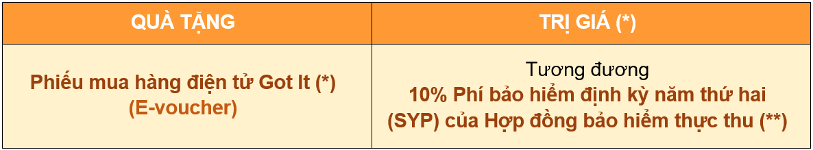 Lưu ý: Khách hàng đóng phí bảo hiểm trong thời gian khuyến mại nhưng trước ngày đến hạn đóng phí định kỳ năm thứ hai của HĐBH thì khoản phí bảo hiểm Khách hàng đóng sẽ được hệ thống ghi nhận là phí bảo hiểm đóng thêm (top-up) hoặc phí treo (phí không được ghi nhận vào Hợp đồng bảo hiểm), không được xem là Phí bảo hiểm định kỳ năm thứ hai (SYP) và Khách hàng sẽ không nhận được khuyến mại trong trường hợp này.