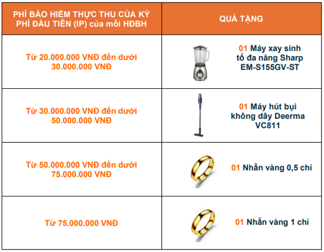 Khách hàng thỏa các điều kiện khuyến mại theo quy định sẽ nhận được quà tặng theo cơ cấu sau: