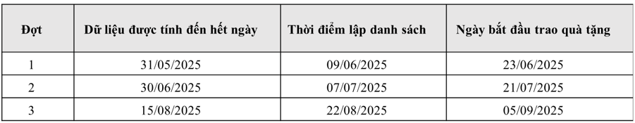 a) HLV sẽ lập danh sách khách hàng đủ điều kiện nhận quà tặng của Chương trình khuyến mại theo từng đợt vào các thời điểm sau: