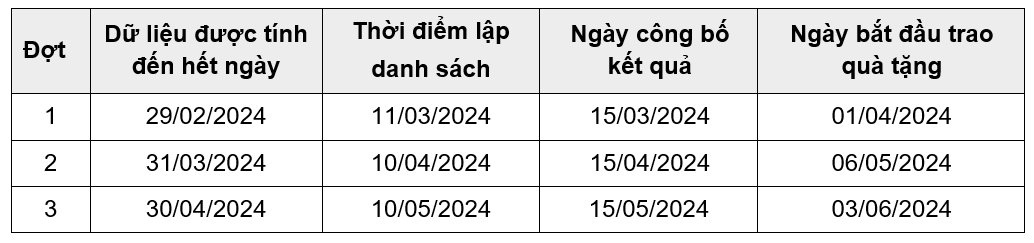 - Danh sách Khách hàng đủ điều kiện nhận quà tặng Đợt 3 bao gồm: (i) các Khách hàng có HĐBH thỏa điều kiện Chương trình khuyến mại nêu tại Mục 5.1, được phát hành từ ngày 01/03/2024 đến hết ngày 31/03/2024 và (ii) các Khách hàng có HĐBH thỏa điều kiện Chương trình khuyến mại, được phát hành từ ngày 01/02/2024 đến hết ngày 29/02/2024 nhưng chưa được ghi nhận tại danh sách Đợt 2.