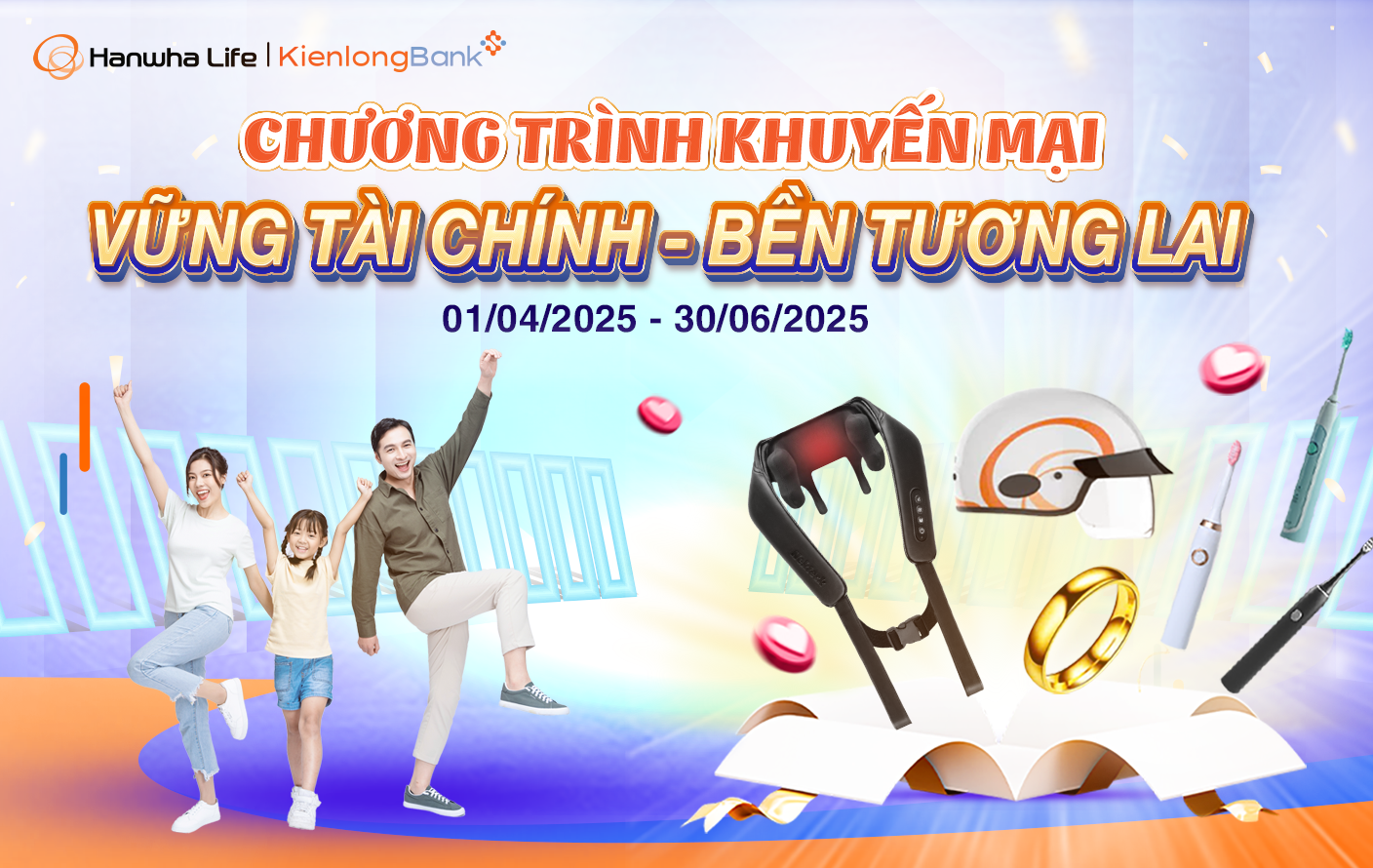 Nhằm tiếp tục mang đến cho khách hàng những kế hoạch bảo vệ và tài chính ưu việt, Hanwha Life Việt Nam (HLV) triển khai chương trình khuyến mại “VỮNG TÀI CHÍNH – BỀN TƯƠNG LAI” dành cho khách hàng tham gia Hợp đồng bảo hiểm của HLV được phân phối thông qua Ngân hàng Thương mại Cổ phần Kiên Long (KienlongBank) với chi tiết như sau: