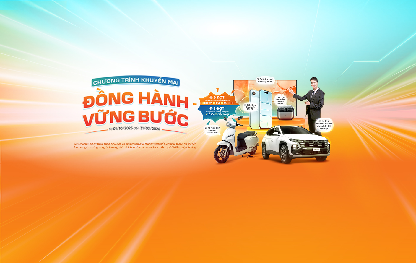 Chương trình khuyến mại “Đồng Hành Vững Bước” gồm 6 đợt quay số hàng tháng (tổ chức lần lượt từ tháng 11/2025 đến tháng 4/2026) và 1 đợt quay số đặc biệt cuối chương trình (tháng 4/2026), mang đến cho khách hàng nhiều cơ hội trúng thưởng trong suốt thời gian khuyến mại.