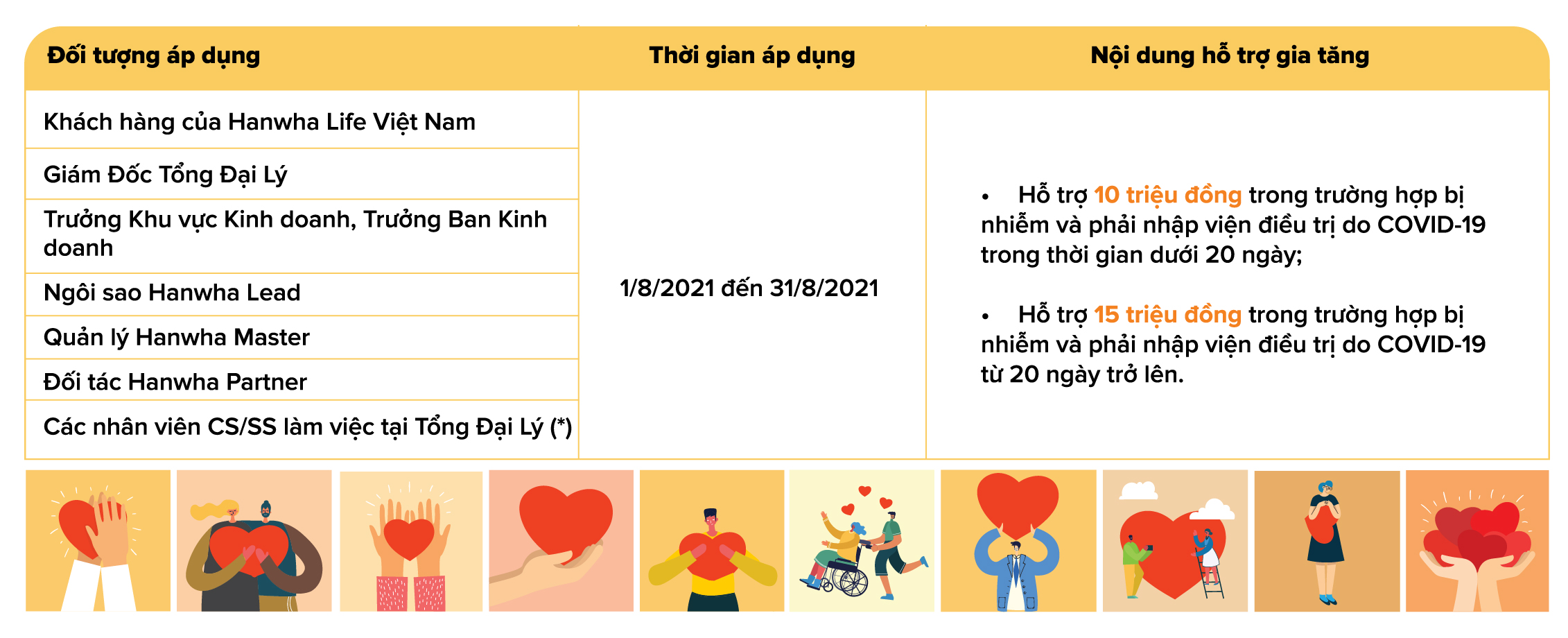 Nhằm đồng hành và san sẻ khó khăn trong giai đoạn dịch Covid-19 diễn biến phức tạp, Hanwha Life Việt Nam thông báo tiếp tục triển khai “Chương trình Chăm Sóc Đặc Biệt Hanwha Life - Đồng Hành Bảo Vệ” dành cho lực lượng kinh doanh nòng cốt và mở rộng thêm đối tượng hỗ trợ là các khách hàng hiện hữu của Hanwha Life Việt Nam trong tháng 8/2021, với nguồn kinh phí lên đến 2 tỷ đồng. Chương trình “Hanwha Life – Đồng Hành Bảo Vệ” sẽ hỗ trợ cho các trường hợp được xác định dương tính với virus SARS-CoV-2 (Covid-19) và phải nhập viện điều trị như sau: