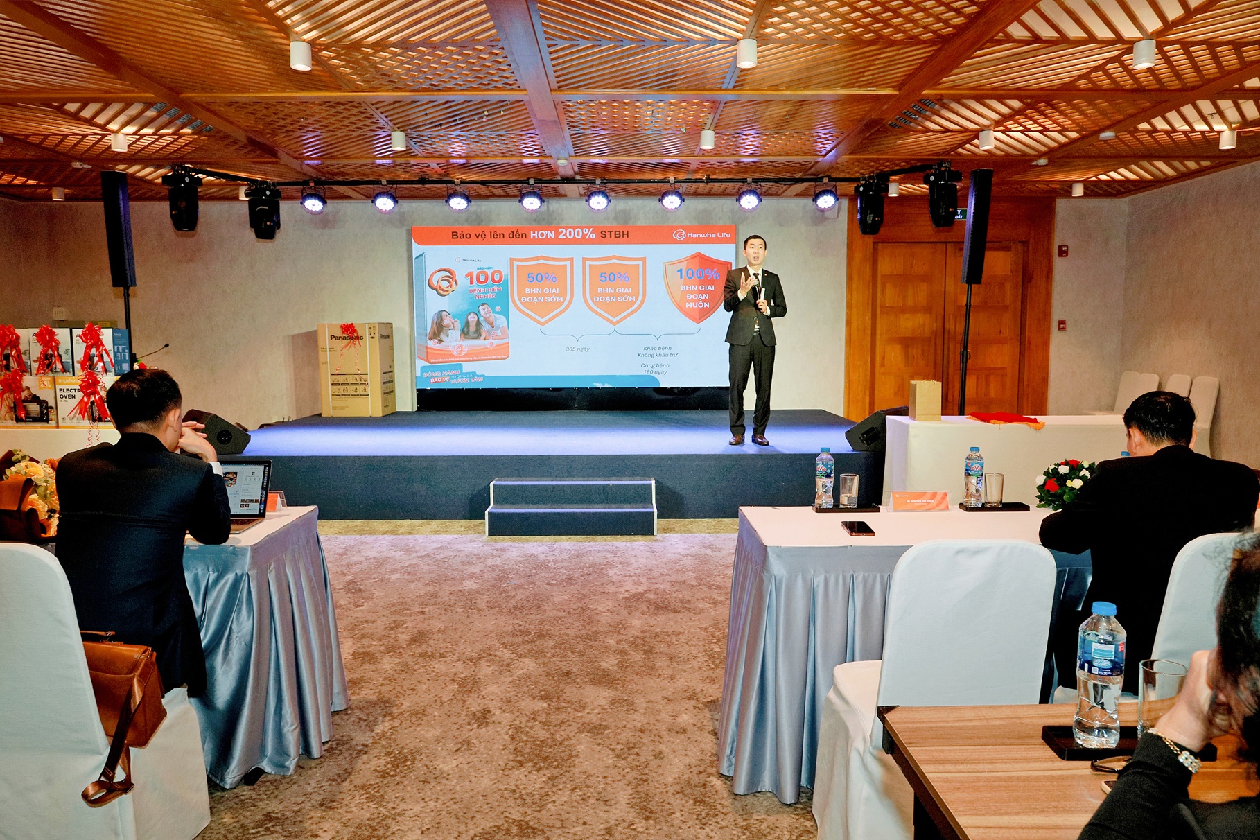 Anh Nguyễn Thế Thiêm – Giám đốc Kinh Doanh Vùng - Hanwha Life Việt Nam giới thiệu các sản phẩm mới tại chương trình