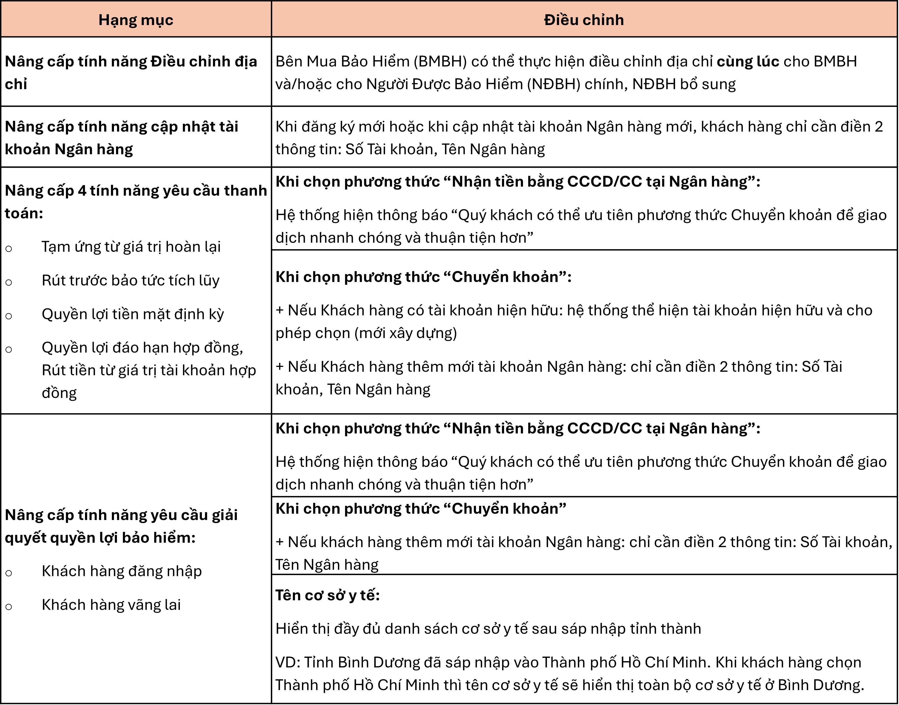 2. Bên cạnh đó, một số tính năng liên quan trên ứng dụng Hanwha Life + và Cổng thông tin khách hàng (CPO) đã được nâng cấp và đồng bộ, nhằm hỗ trợ Khách hàng thuận tiện kiểm tra, rà soát và điều chỉnh thông tin khi cần thiết; đồng thời giúp việc tiếp nhận, xử lý các yêu cầu và quyền lợi bảo hiểm được thực hiện nhanh chóng, thông suốt và hiệu quả hơn.