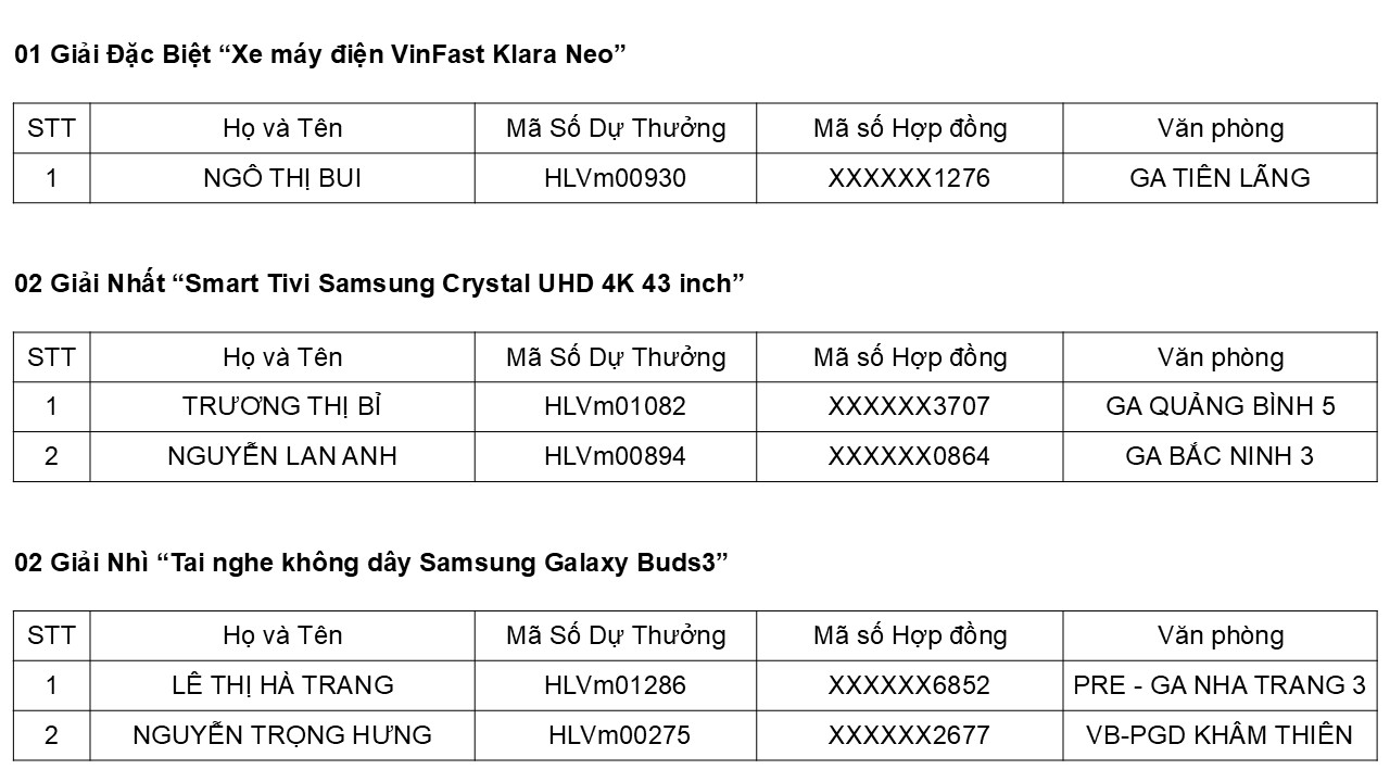 - Đối với Giải Đặc biệt, ngoài chịu thuế thu nhập cá nhân theo quy định trên, Khách hàng trúng thưởng chịu trách nhiệm thực hiện các thủ tục cần thiết theo quy định của pháp luật để đăng ký quyền sở hữu tài sản và tự chịu các khoản thuế, phí, lệ phí (lệ phí cấp biển, thuế trước bạ…) cho việc thực hiện thủ tục này.