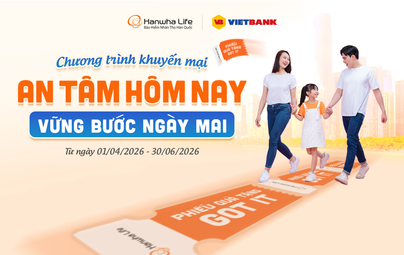 Nhằm mang đến cho Khách hàng những quà tặng hấp hẫn khi tham gia sản phẩm bảo hiểm của Hanwha Life Việt Nam (“Hanwha Life”) thông qua Ngân hàng Thương mại Cổ phần Việt Nam Thương Tín (“Vietbank”), Hanwha Life thông báo triển khai chương trình khuyến mại “AN TÂM HÔM NAY - VỮNG BƯỚC NGÀY MAI” với chi tiết như sau: