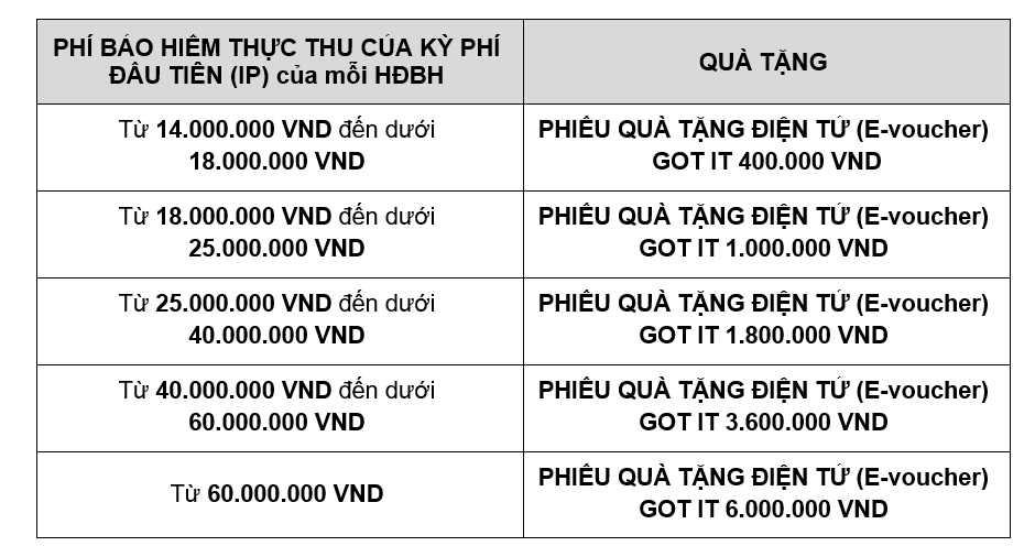 c. Phí bảo hiểm thực thu của kỳ phí đầu tiên (IP) của HĐBH của Khách hàng: Từ 14.000.000 VND trở lên