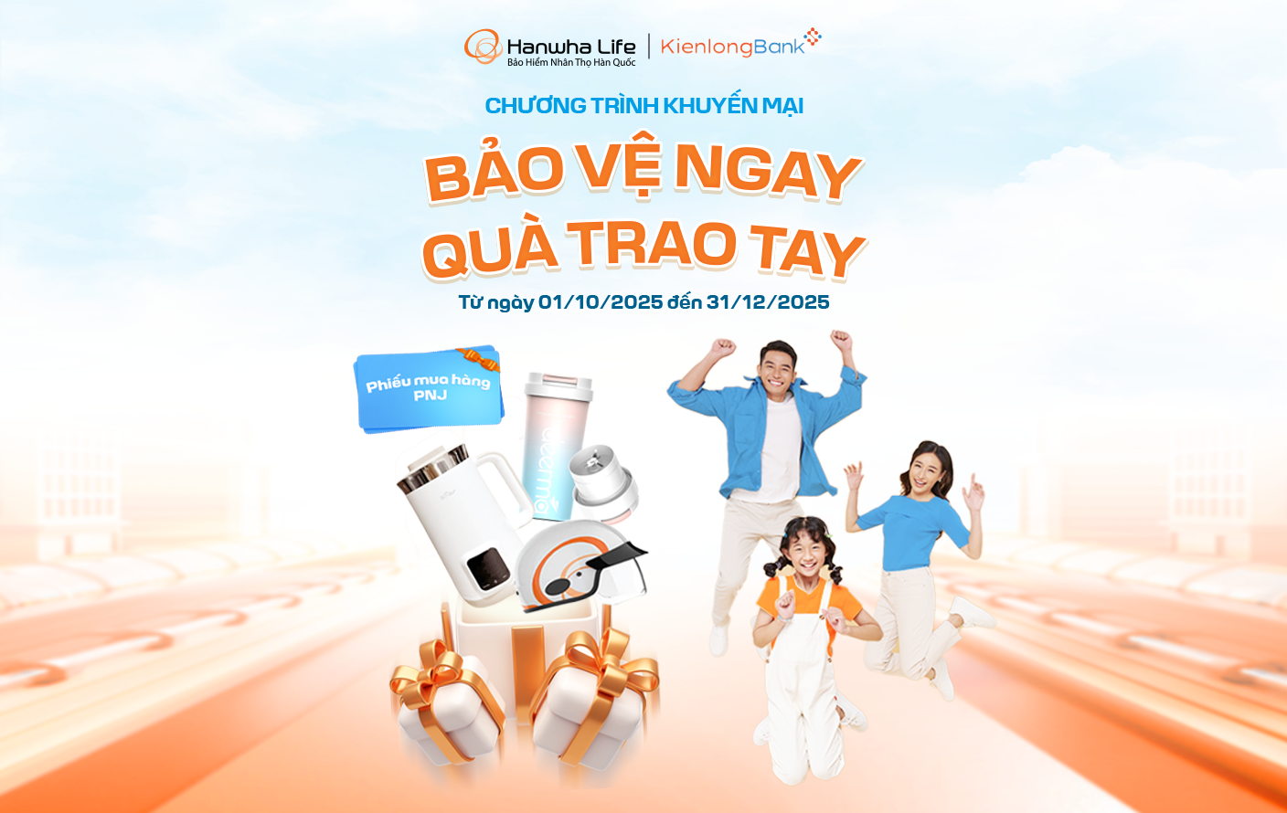 Với mục tiêu cam kết mang đến cho khách hàng những kế hoạch bảo vệ sức khỏe và tài chính ưu việt, Hanwha Life Việt Nam triển khai chương trình khuyến mại “BẢO VỆ NGAY – QUÀ TRAO TAY” dành cho Khách hàng tham gia Hợp đồng bảo hiểm của Hanwha Life Việt Nam được phân phối thông qua Ngân hàng Thương mại Cổ phần Kiên Long (KienlongBank) với chi tiết như sau: