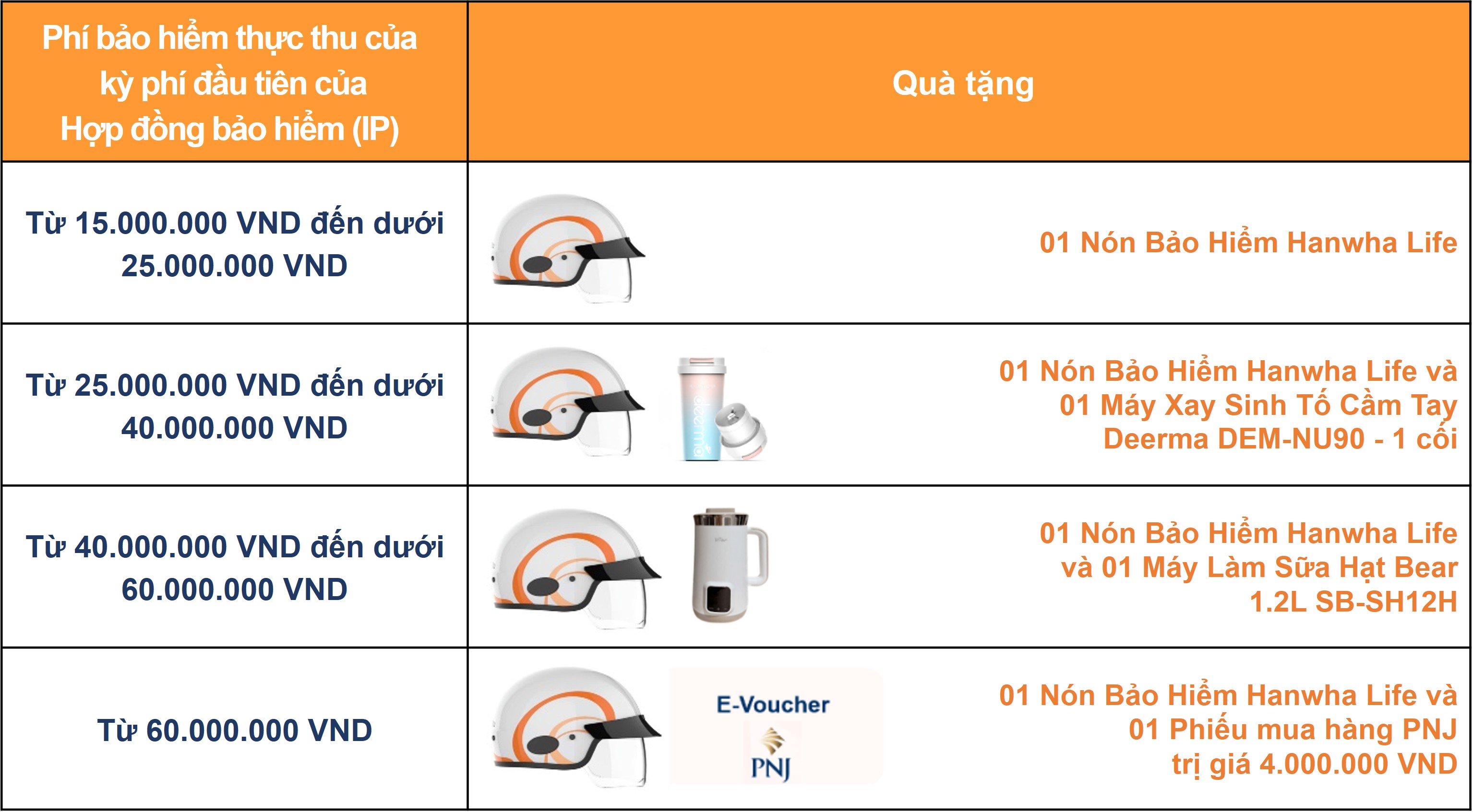 - Trường hợp đến thời điểm trao quà nếu vì một lý do nào đó mà Hanwha Life Việt Nam không thể cung cấp các quà tặng đã nêu, Hanwha Life Việt Nam sẽ thay thế bằng quà tặng khác cùng loại có giá trị tương đương và thông báo tới Khách hàng đủ điều kiện nhận quà.