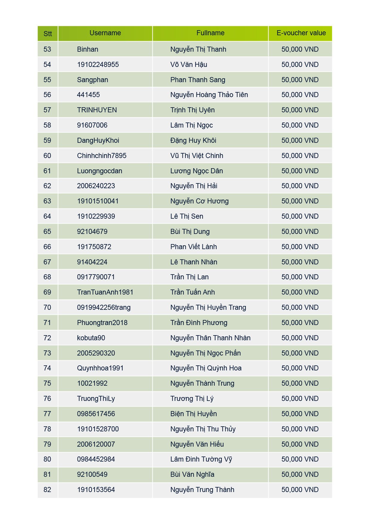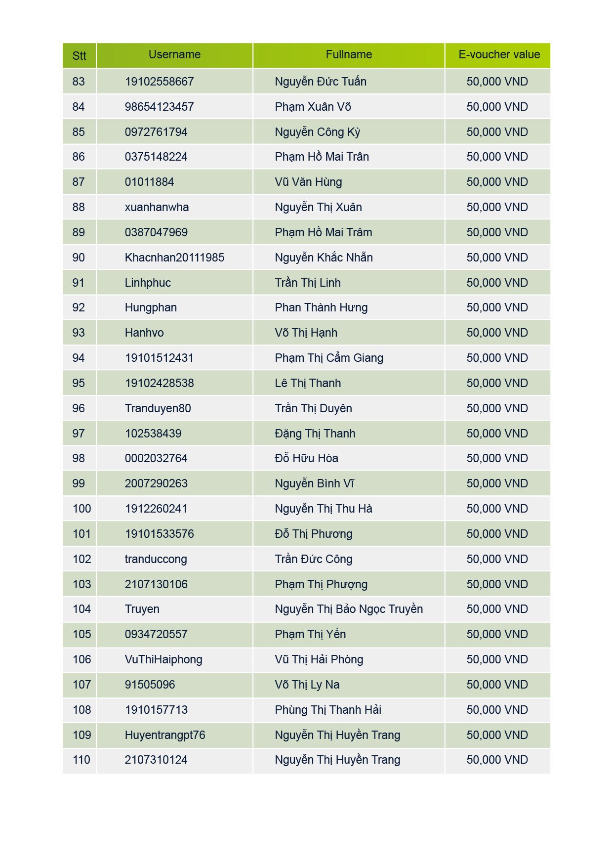 Tuần 2 chương trình khuyến mãi "Tải Lime Dễ Dàng, Muôn Ngàn Quà Tặng" đã khép lại và sau đây là danh sách 110 bạn nhận được E-voucher trị giá 100.000đ và 50.000đ. Hãy cùng xem nhé!