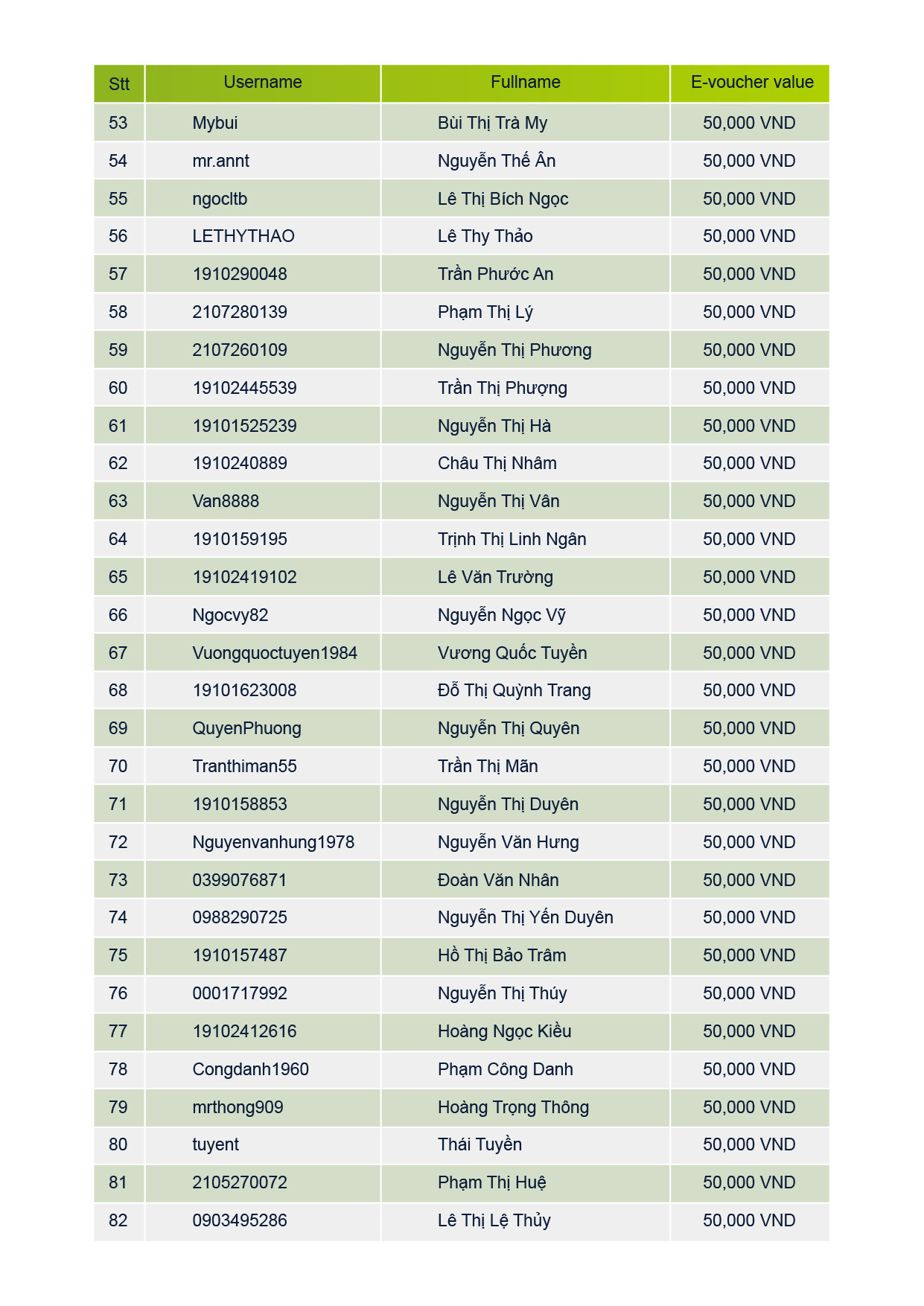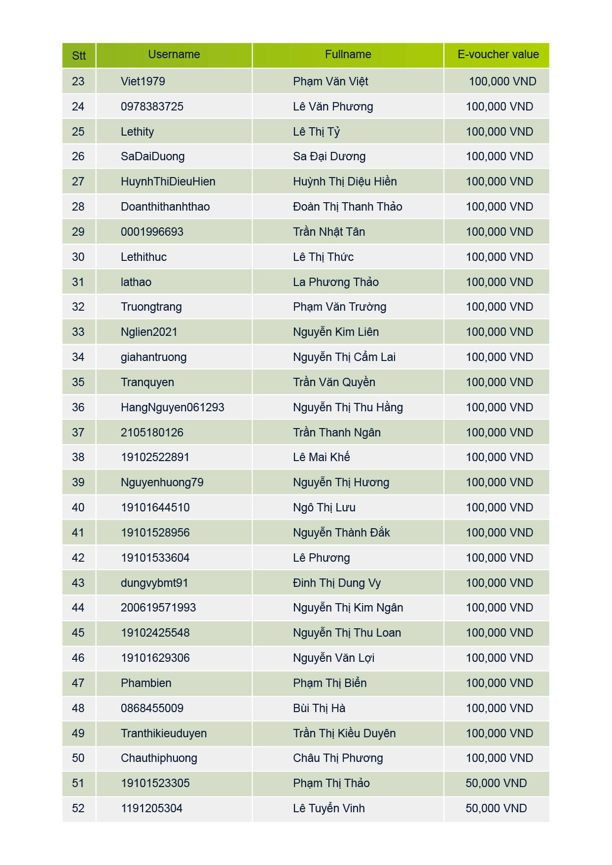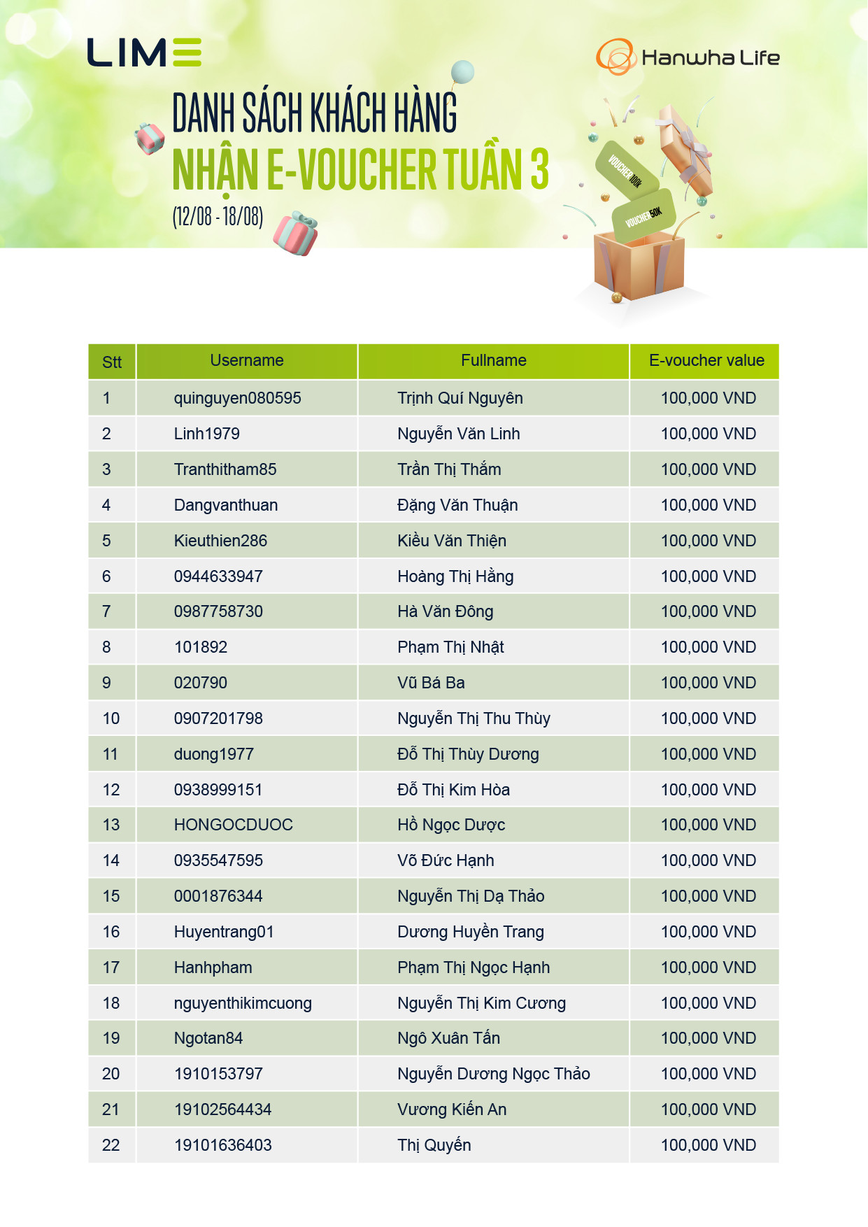 Tuần 3 chương trình khuyến mãi "Tải Lime Dễ Dàng, Muôn Ngàn Quà Tặng" đã khép lại và sau đây là danh sách 110 bạn nhận được E-voucher trị giá 100.000đ và 50.000đ. Hãy cùng xem nhé!