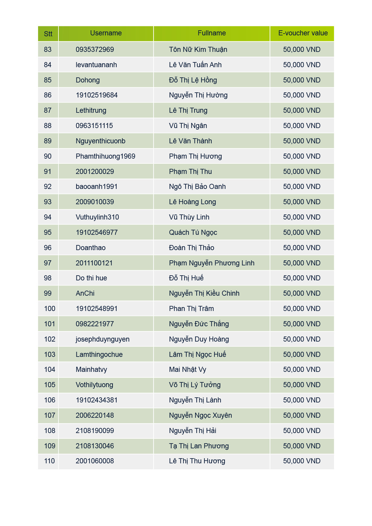 Danh sách 110 bạn nhận được E-voucher trị giá 100.000đ và 50.000đ trong tuần 4 chương trình khuyến mãi "Tải Lime Dễ Dàng, Muôn Ngàn Quà Tặng" đã có. Hãy cùng xem nhé!