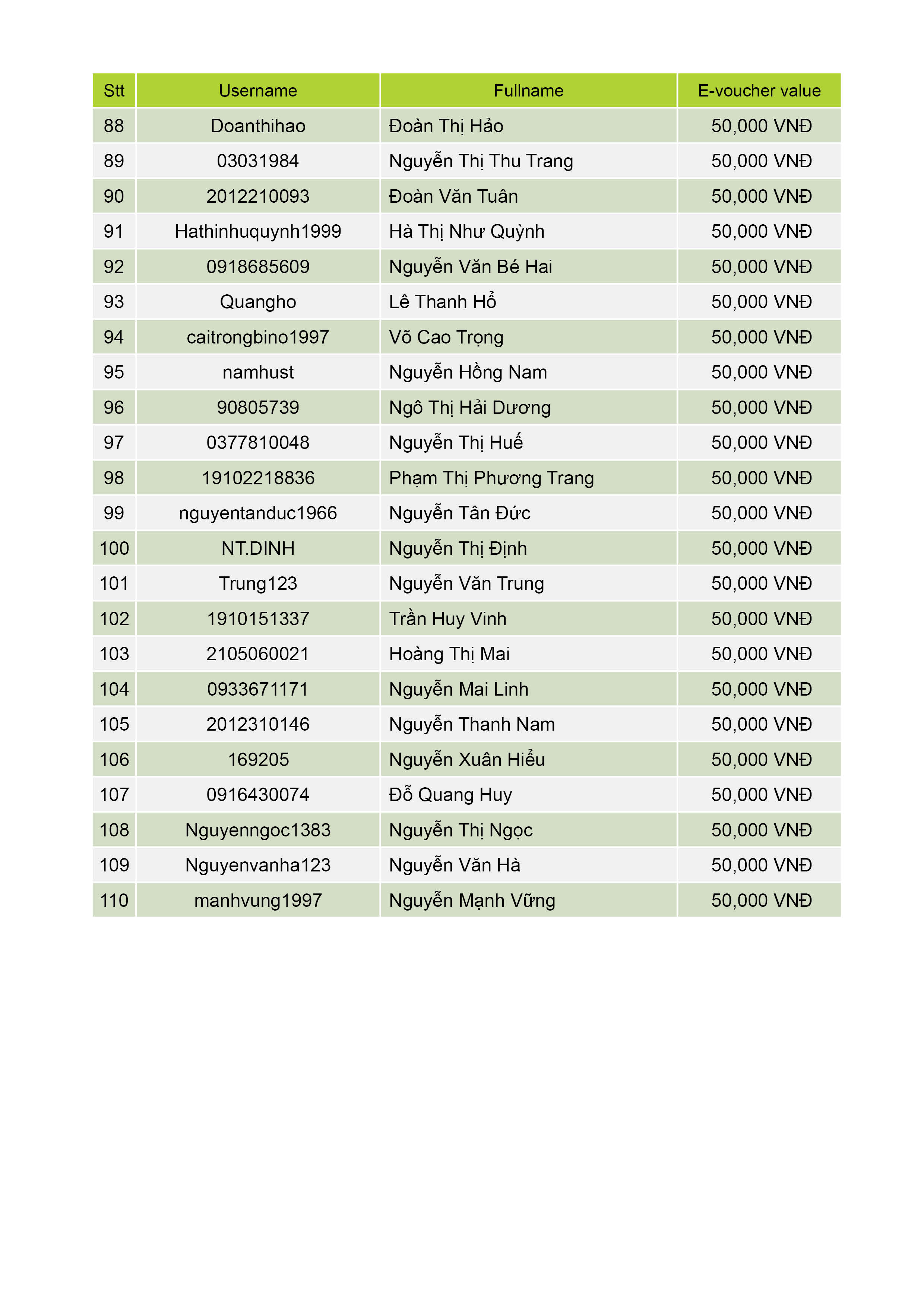 Danh sách 110 bạn nhận được E-voucher trị giá 100.000đ và 50.000đ trong tuần 9 chương trình khuyến mãi "Tải Lime Dễ Dàng, Muôn Ngàn Quà Tặng" đã có.