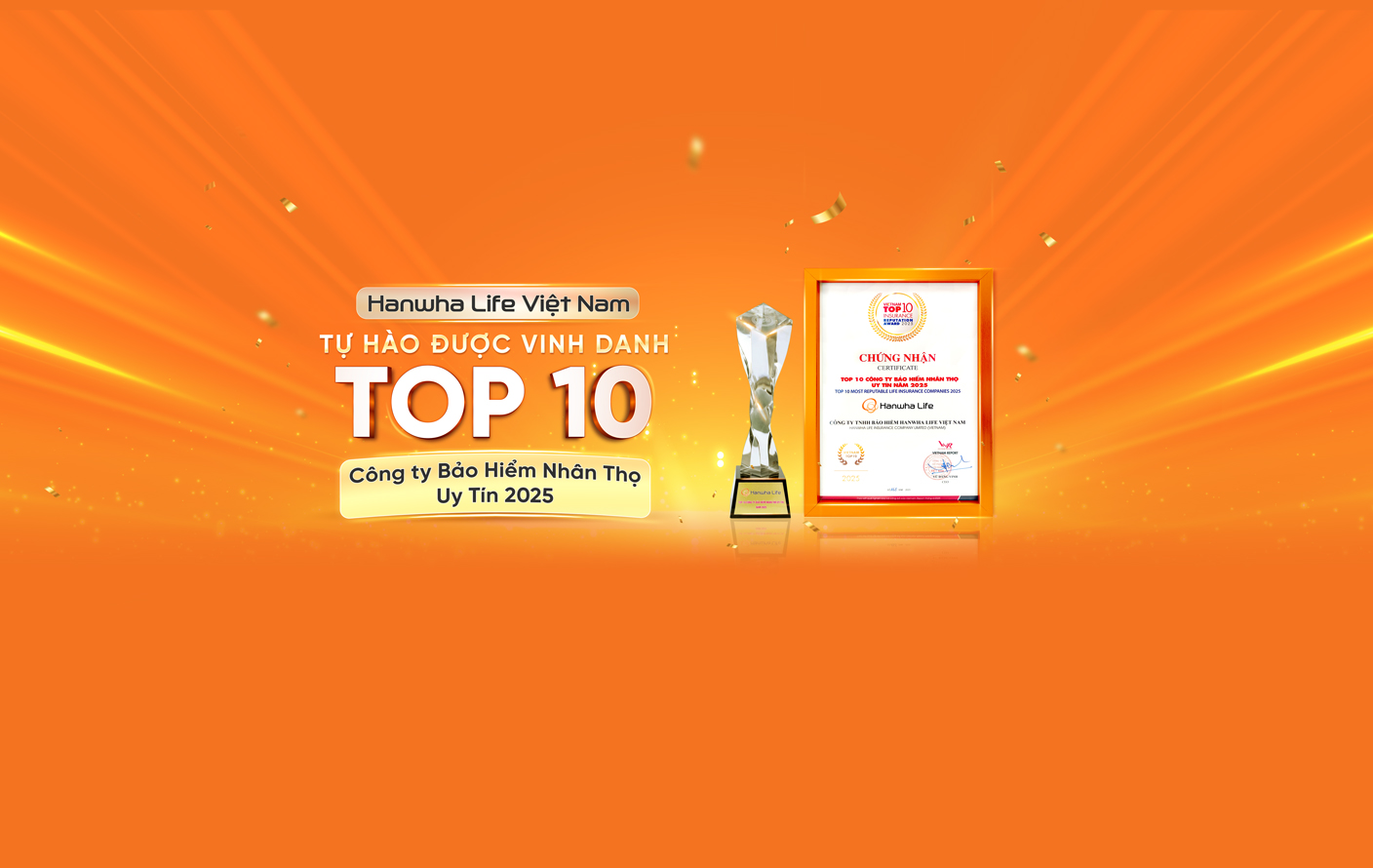 Ngày 1/8/2025 Hanwha Life Việt Nam đã được vinh danh trong Lễ công bố “Top 10 công ty bảo hiểm nhân thọ uy tín” do Vietnam Report tổ chức tại Tp.HCM. Đây cũng là năm thứ 9 liên tiếp công ty tự hào giữ vững danh hiệu này kể từ năm 2017.