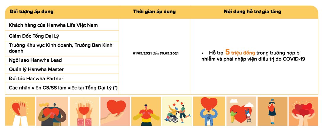Nhằm tiếp tục đồng hành và san sẻ khó khăn trong giai đoạn dịch Covid-19 tiếp tục diễn biến phức tạp, Hanwha Life Việt Nam xin thông báo tiếp tục triển khai có điều chỉnh Chương trình chăm sóc đặc biệt “Hanwha Life - Đồng Hành Bảo Vệ” trong tháng 9/2021, với nguồn kinh phí ban đầu lên đến 2 tỷ đồng. Chương trình “Hanwha Life – Đồng Hành Bảo Vệ” sẽ hỗ trợ cho các trường hợp được xác định dương tính với virus SARS-CoV-2 (Covid-19) và phải nhập viện điều trị như sau: