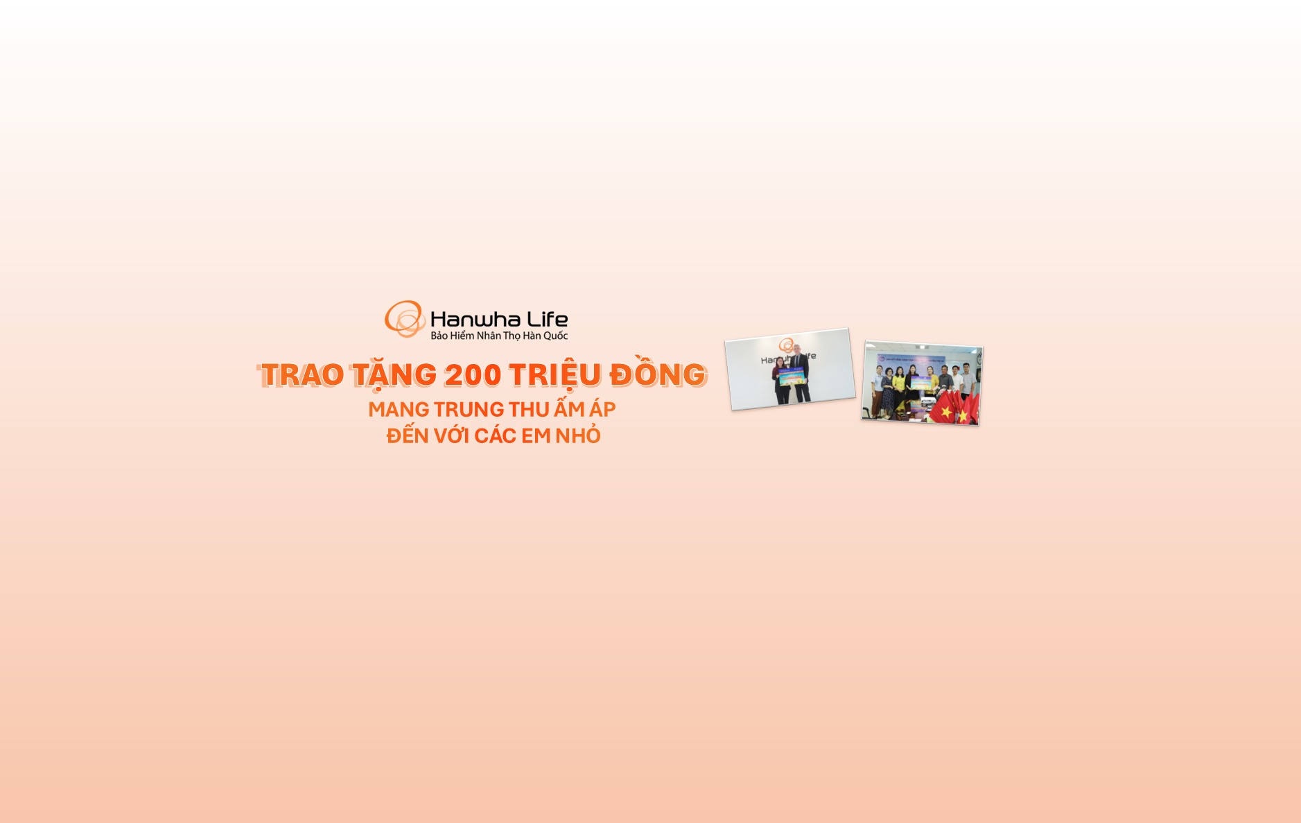 Dịp trung thu năm nay, tập thể Ban lãnh đạo cùng Công đoàn Hanwha Life Việt Nam đã chung tay đóng góp tổng số tiền 200 triệu đồng và thông qua 2 tổ chức là Hội Bảo vệ Quyền trẻ em Việt Nam và Saigonchildren để thực hiện các chương trình hỗ trợ trẻ em tại nhiều địa phương trên cả nước với mong muốn mang đến cho các em nhỏ một tuổi thơ tròn đầy và hạnh phúc.
