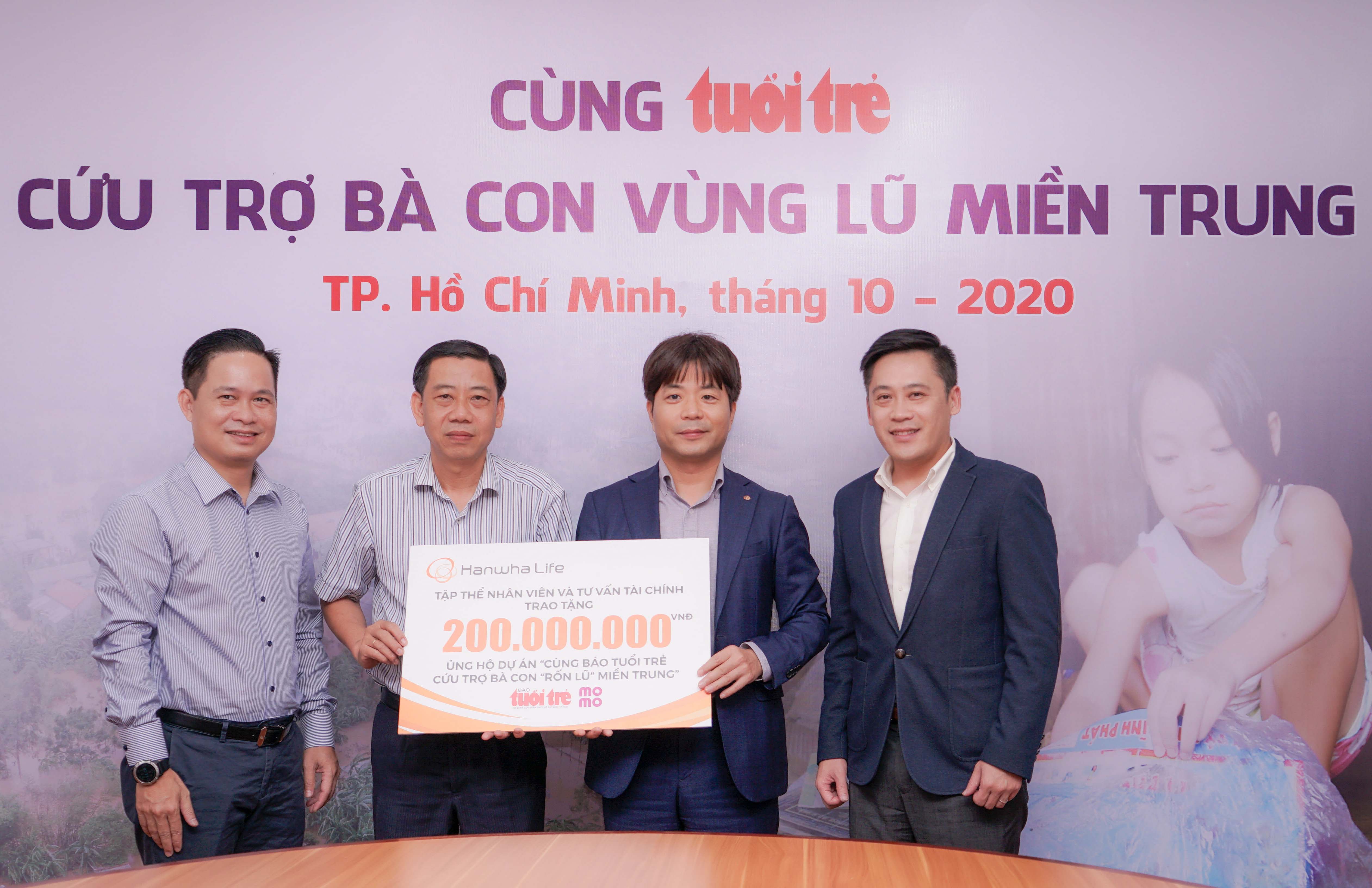 Hướng tới người dân miền Trung đang gặp nhiều khó khăn và thiệt hại do bão lũ, chiều ngày 27 tháng 10, Hanwha Life Việt Nam đã trao tặng 200 triệu cho dự án “Cùng Tuổi Trẻ cứu trợ bà con vùng lũ miền Trung” do Báo Tuổi Trẻ phối hợp với Ví điện tử MoMo cùng thực hiện. Đây là sự hỗ trợ kịp thời và có ý nghĩa thiết thực trong bối cảnh người dân, nhân viên, lực lượng kinh doanh và khách hàng của Hanwha Life Việt Nam tại miền Trung đang gánh chịu hậu quả nặng nề do mưa lũ.