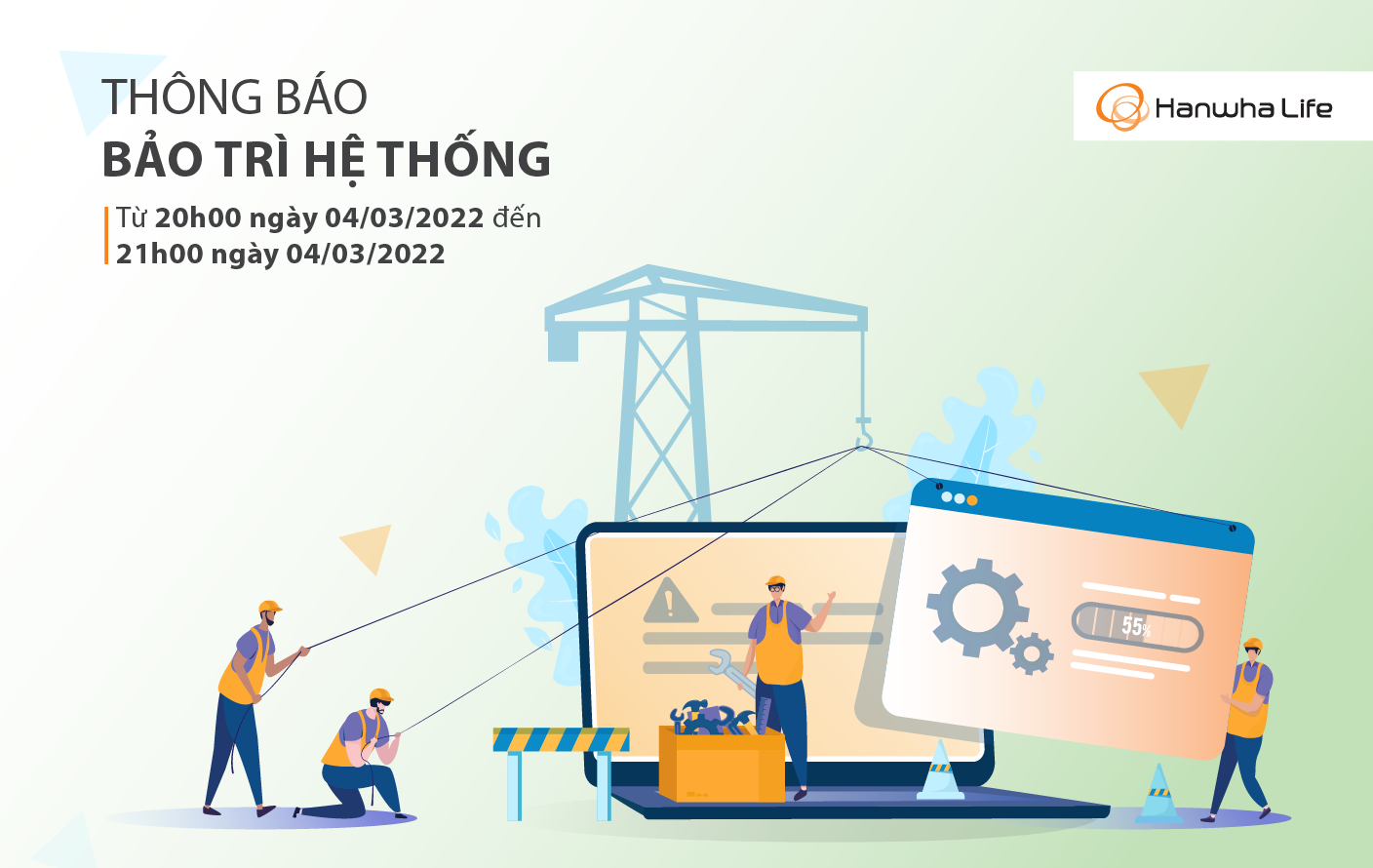 Nhằm cải thiện chất lượng dịch vụ, Hanwha Life Việt Nam sẽ tiến hành nâng cấp và bảo trì toàn diện các hệ thống trong khoảng thời gian từ 20h00 ngày 04/03/2022 đến 21h00 ngày 04/03/2022.