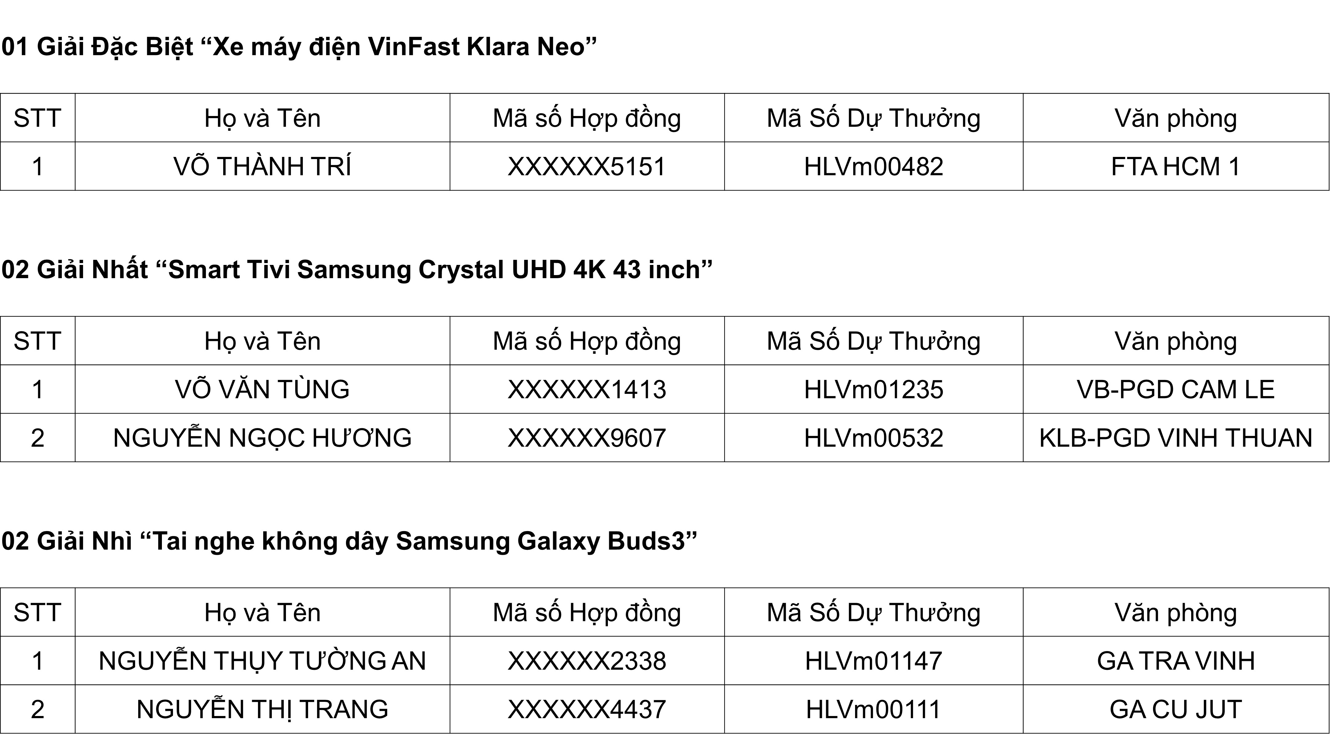 - Đối với Giải Đặc biệt, ngoài chịu thuế thu nhập cá nhân theo quy định trên, Khách hàng trúng thưởng chịu trách nhiệm thực hiện các thủ tục cần thiết theo quy định của pháp luật để đăng ký quyền sở hữu tài sản và tự chịu các khoản thuế, phí, lệ phí (lệ phí cấp biển, thuế trước bạ…) cho việc thực hiện thủ tục này.