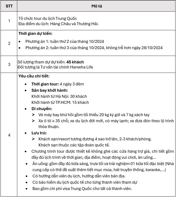 - Phương thức tiến hành: Nhà cung cấp được mời đến chào thầu và hội đồng đánh giá của Hanwha Life sẽ cùng tham gia buổi chào thầu. Sau đó, Hội đồng đánh giá sẽ tiến hành mở hồ sơ dự thầu, chấm điểm hồ sơ thầu của nhà cung cấp sau khi kiểm tra giá và đánh giá tại chỗ để lựa chọn Nhà thầu có những đề xuất phù hợp nhất theo yêu cầu chuyến đi của Hanwha Life.